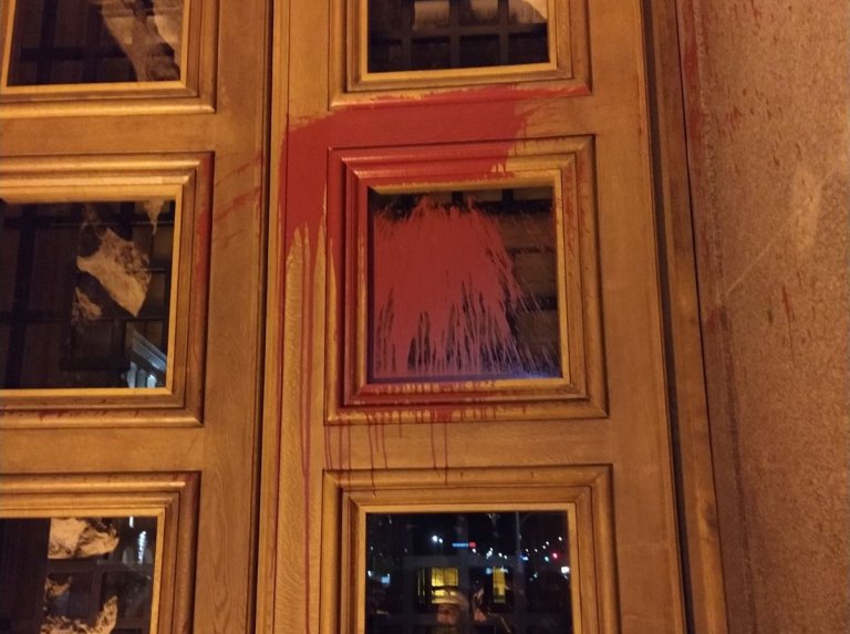 Според Златанов пред бившия Партиен дом, който понастоящем е сграда на Народното събрание, са били хвърлени две бомби. Един от протестиращите е паднал вследствие на такава, а двама полицаи са клекнали, за да му окажат помощ, разказа зам.-директорът на СДВР. По думите му без никаква намеса на полицейски служители е започнало масово замеряне с кутии и пликове с червена боя.