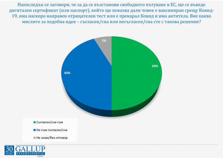 Българите все още са разделени по отношение на идеята за т.нар. "ваксинационни паспорти": 50% по-скоро са съгласни, 43% са против тях.