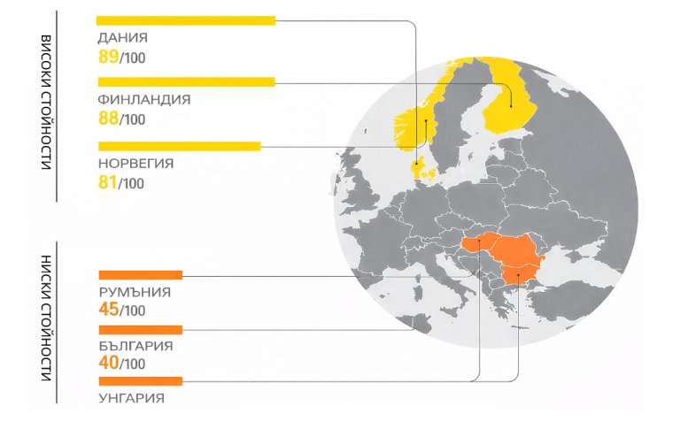 Средната стойност за държавите от ЕС е 62 точки, което допълнително подчертава изоставането на България.