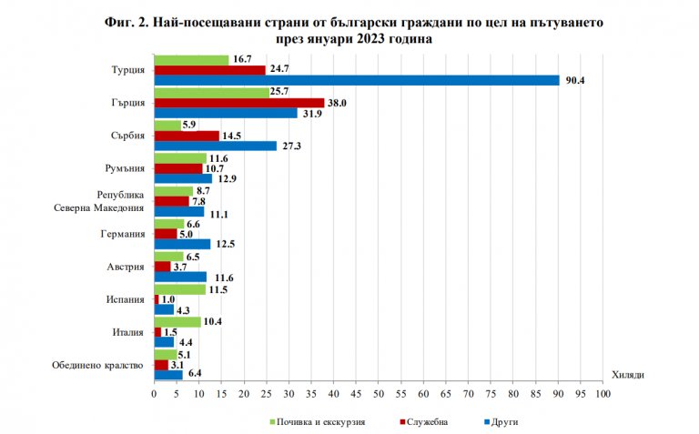Най-много посещения в България през януари 2023 г. са реализирали гражданите от: Турция - 148,4 хил., Румъния - 117,4 хил., Гърция - 102 хил., Република Северна Македония - 51,4 хил., Украйна - 49,3 хил., Сърбия - 43,3 хил., Германия - 25,7 хил., Великобритания - 20,4 хил., Израел - 15,5 хил. и Италия - 14,2 хиляди.