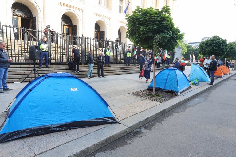 Палатков лагер бе разпънат пред сградата на Съдебната палата тази сутрин от протестиращи, които искат оставката на главния прокурор Иван Гешев. Палатките са разположени пред централния вход и не пречат на движението на трамваите.