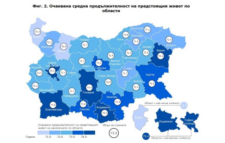 Най-ниска е очакваната продължителност на живота в област Видин - 70,3 години, докато най-висока е тя в областите София и Кърджали - 75,4 години.