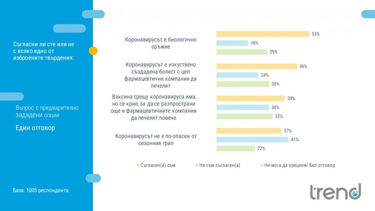 Малко над половината от българите (53%) вярват, че коронавирусът е създаден като биологично оръжие, а 46 на сто са на мнение, че той е направен от фармацевтивните компании, за да печелят повече пари. 39% пък смятат, че ваксина вече има, но се крие, за да се разпространи още вируса и фармацевтичните компании да печелят повече.