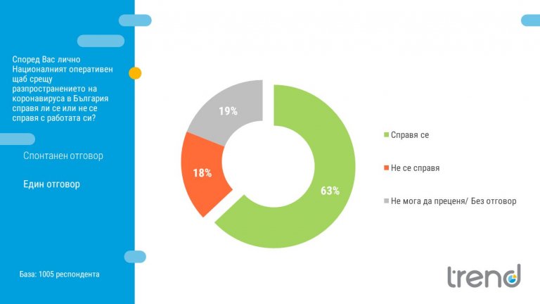 Това показват данните от проучването на Изследователски център "Тренд" по поръчка на в. "24 часа". Изследването е проведено сред общо 1005 пълнолетни българи, като от тях 400 респонденти са интервюирани с през интернет по системата CAWI, а 605 са интервюирани с пряко телефонно интервю. Перидоът на извадката е 1-5 април.