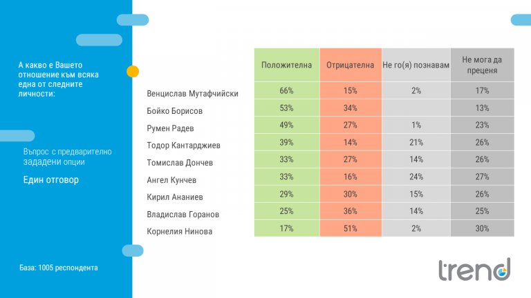 Томислав Дончев е с положително отношение от 33% и с отрицателно 27%. Кирил Ананиев и Владислав Горанов са с по-високи дялове на отрицателно отношение за сметка на положителното. Корнелия Нинова е с 51% отрицателно отношение и със 17% положително.