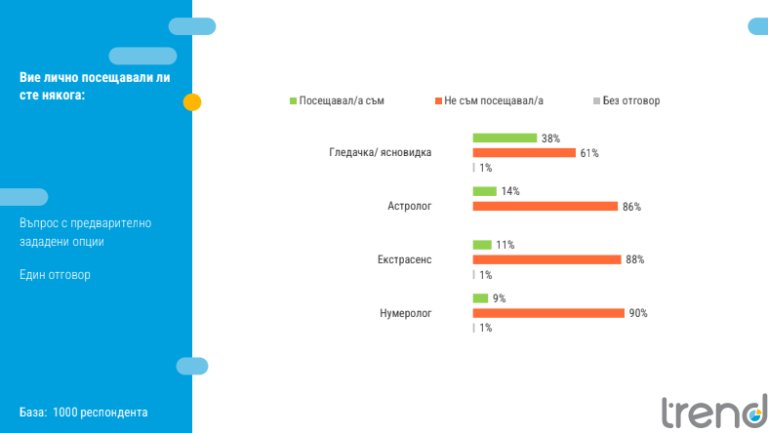- 38% потвърждават, че са посещавали гледачка/ясновидка