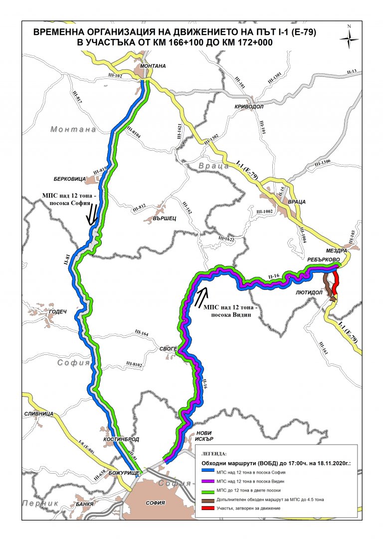 В сила влизат обходни маршрути, като леките автомобили и превозни средства до 12 тона, които пътуват към София и Видин, ще преминават през прохода "Петрохан" и Искърското дефиле.