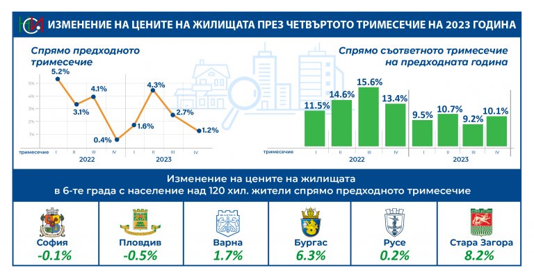 Цените на жилищата в страната са се вдигнали с 1,2% през четвъртото тримесечие на 2023 г. спрямо предходното тримесечие. Това става ясно от справка на Националния статистически институт.