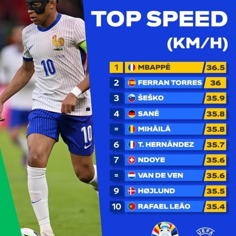 Френският нападател Килиан Мбапе е лидерът на Евро 2024 по достигната максимална скорост сред всички футболисти, участващи на континенталния шампионат.