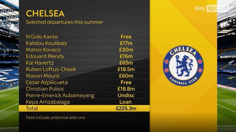 За футболисти като Кай Хаверц, Мейсън Маунт, Матео Ковачич, Калиду Кулибали, Кристиан Пулишич, Едуар Менди, Рубен Лофтъс-Чийк и Итън Ампаду бяха получени трансферни суми.