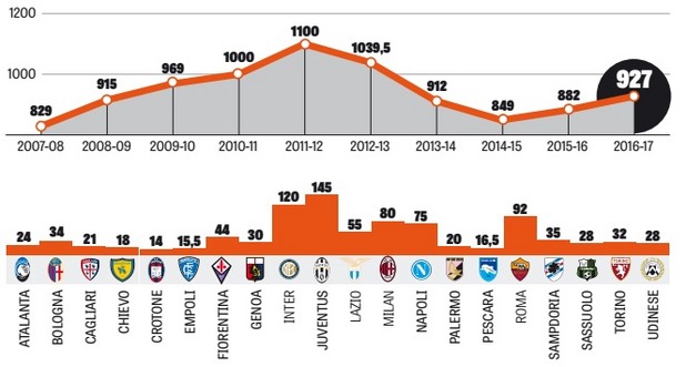 Ако трябва да сме точни - 985 млн. ще бъдат изплатени под формата на възнаграждения за сезона в Калчото, като в тази сума не влизат премиите и бонусите.