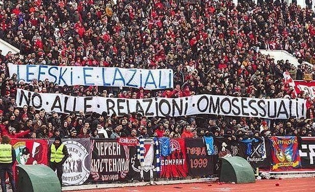 „Червените“ бяха издигнали надпис, с който осмяха „близките“ отношения между агитките на Лацио и „сините“, на който пишеше: „Лефски и „лациалите“ – не на хомосексуалните отношения“.