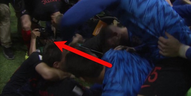 На грешното или на точното място? Трудно е да се каже къде попадна максикански фотограф, който бе пометен от празнуващите хърватски футболисти след победния им гол в продълженията във вратата на Англия.