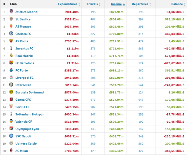 Испанците са прибрали 872.91 млн. паунда за свои играчи, но голямата разлика е, че в същия период са вложили 901.40 млн. паунда в нови попълнения и регистрират отрицателен баланс от минус 31.66 млн.