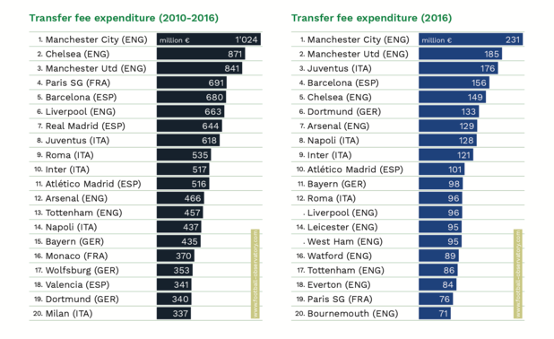 В доклада за 2016-а се вижда, че в топ 20 на отборите, похарчили най-много за трансфери присъстват цели 11 английски тима, което затвърждава позицията на Висшата лига като най-скъпото първенство в света.