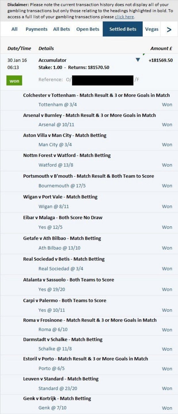 Любителят на залозите сложил 1 паунд под феноменалния си залог, който прави общ коефициент 181,570.
