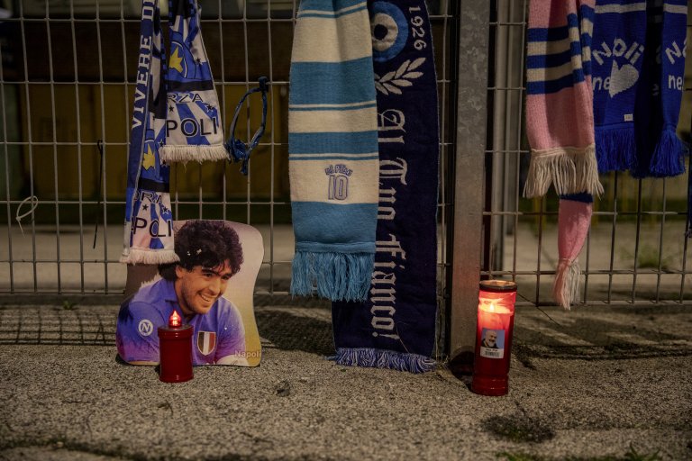 Младо момче слиза от раменете на баща си и опъва шал до безбройните букети. "Израснах с мляко, бисквити и записи на Марадона на касетки VHS преди лягане - казва Лука Бенедуче, бащата на детето. - Така израсна и синът ми." Каква по-нагледна илюстрация на въздействието, което Марадона оказа върху поколения футболни фенове?
