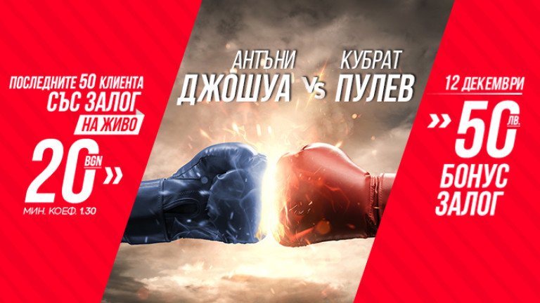 Партньорите ни от WINBET имат специална промоция във във връзка с историческия мач на Кубрат Пулев срещу Антъни Джошуа. Последните 50 потребители на www.winbet.bg, които направят залози от минимум 20 лв. за срещата "на живо" (по време на мача) ще получат по 50 лв. бонус средства за залагания, независимо от резултата от техния залог. Повече подробности научете тук.