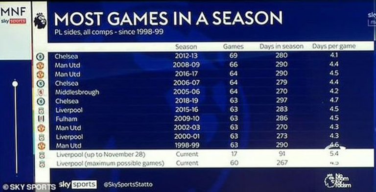 Броят на мачовете?Ливърпул играе игра на всеки 5.4 дни, Ливърпул не е в неравностойно положение, гледайки историята и играчите, които имат, играят мач на всеки 5.4 дни. Не е за голямо оплакване."