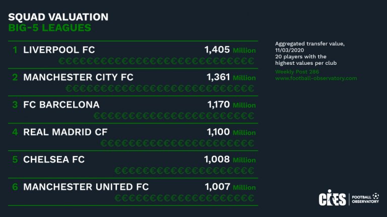 Позицията на Челси в топ 5 е донякъде изненадваща, но от CIES уточняват, че стойността на състава е скочила благодарение на налагането на млади таланти заради трансферната забрана, която "сините" получиха.