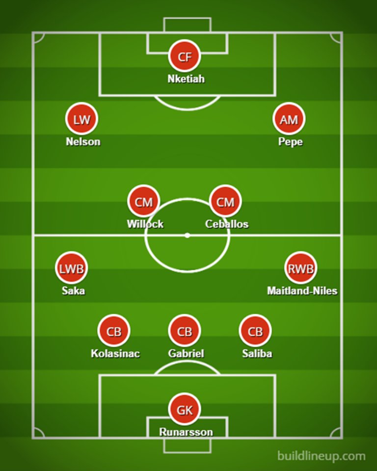 Исландският страж Алекс Рунарсон може да направи дебют за Арсенал, а Джо Уилок, Райс Нелсън, Букайо Сака и Николас Пепе вероятно ще са сред титулярите.