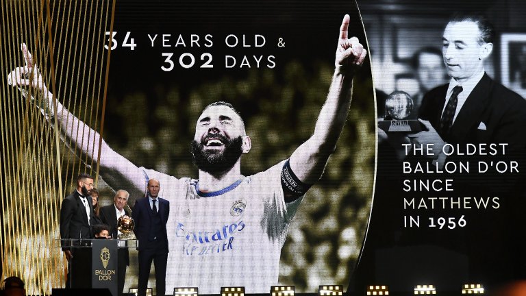 Бензема се превърна и в най-възрастния носител на приза от сър Стенли Матюс през 1956 г. Французинът получи "Златната топка" на 34 г. и 302 дни.