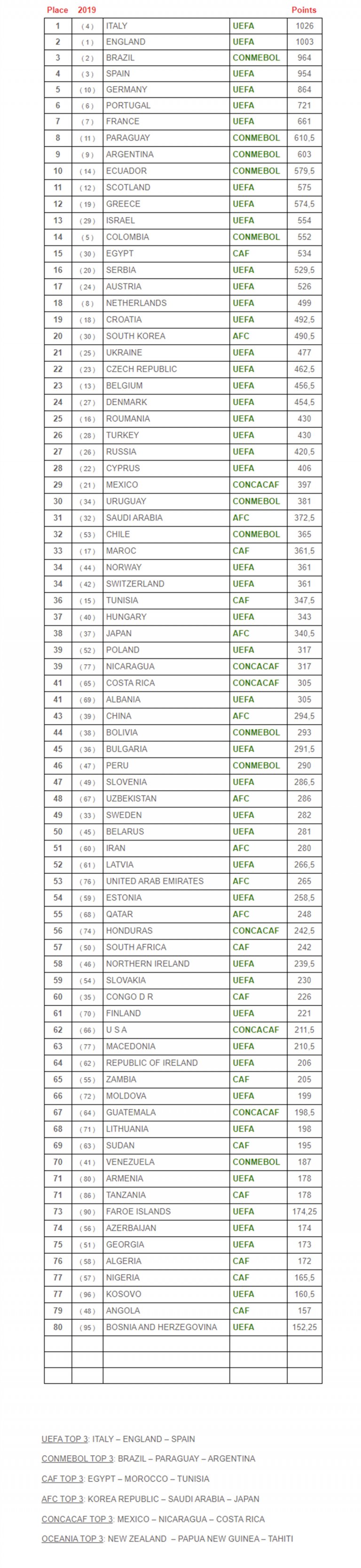 На първо място е италианската Серия "А", следвана от Премиършип на Англия. Изненадващо е и треото място - Бразилия. Българският шампионат е под номер 45, изпреварвайки висшия фуболен ешелон на САЩ - Мейджър Лийг Сокър.