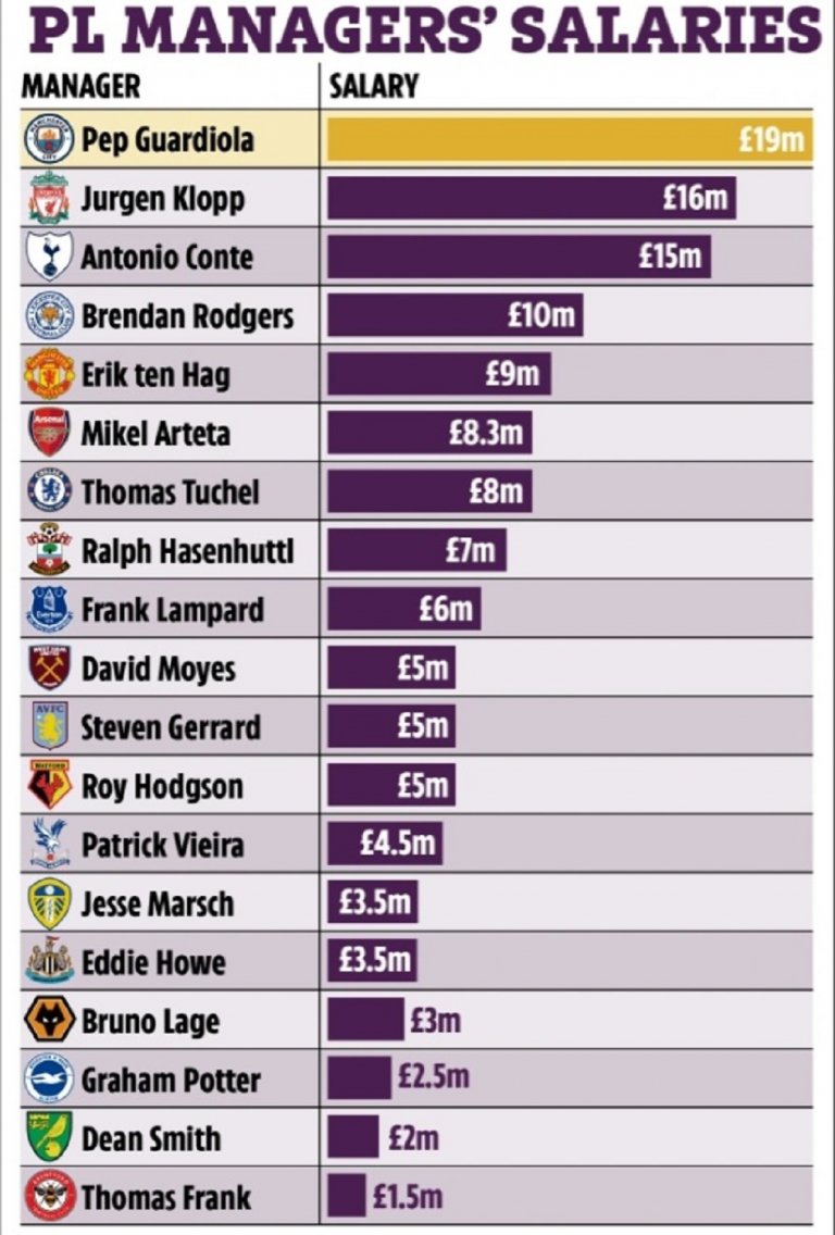 Пред Тен Хаг по заплата е дори и наставникът на Лестър Брендън Роджърс (10 млн. паунда), но Микел Артета в Арсенал (8,3 млн. паунда) и Томас Тухел в Челси (8 млн. паунда) се нареждат след него.