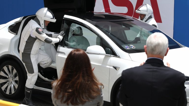Черно-бели електромобили Tesla, в които са настанени космонавтите Робърт Бенкън и Дъглас Хърли. Самите те - облечени в стилни черно-бели скафандри. Целта им е черно-бялата капсула SpaceX Crew Dragon, с която да достигнат Международната космическа станция (МКС).