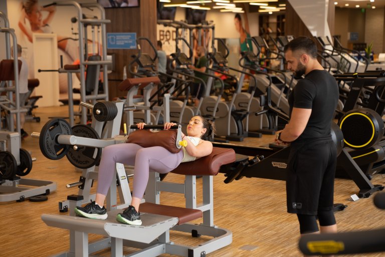 В конкретния ден Анелия и той тренират предимно долната част, отново на суперсерии, като след това преминават и към упражнения за горната част.