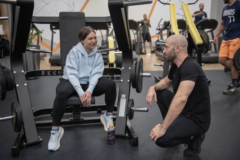 Първото занимание в залата, която е пълна със спортуващи хора дори по обяд в работен ден, всъщност представлява една лека тренировка с удобната екипировка на Asics. В нея Михаил прави редица тестове, като първият е да измери работата на кардиореспираторния апарат на Вики, а след това последва проверка на издръжливостта, силата и мобилността ѝ.