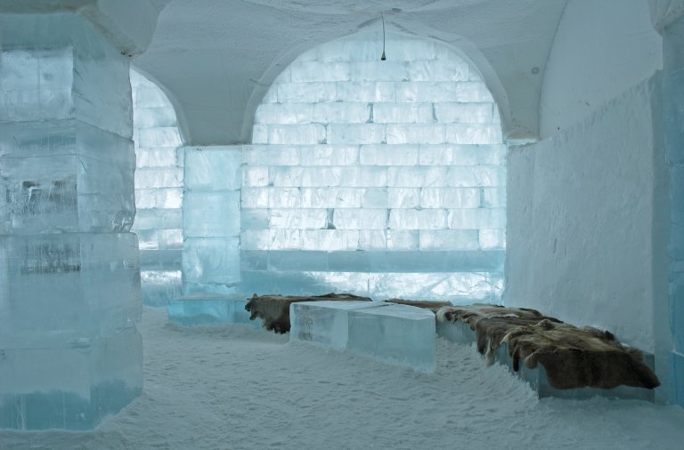 Именно в Норвегия в стаите на един леден хотел има елени, изваяни от лед, и стени от сняг, които напомнят на стволовете на вековни дървета.