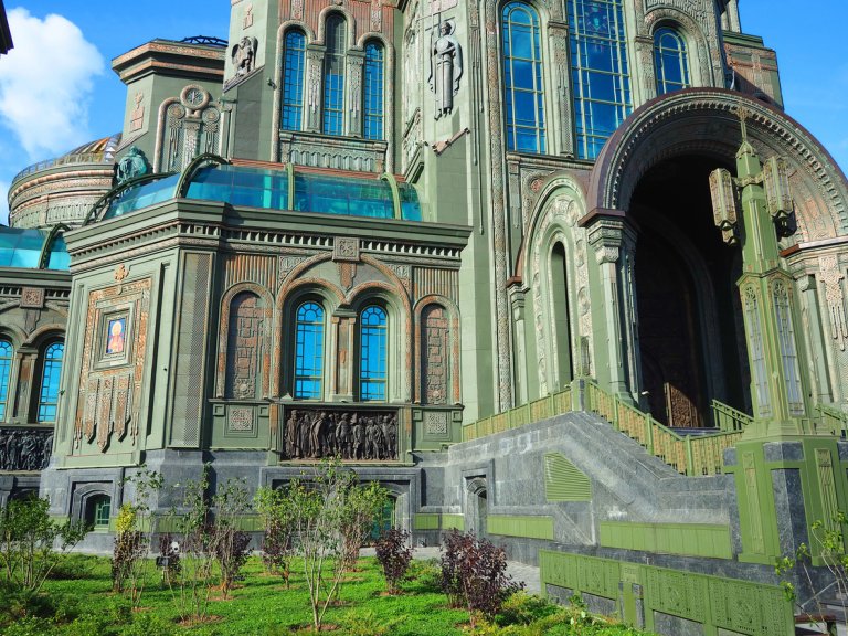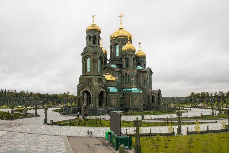 Храмът на въоръжените сили на Русия дължи фасадата си на факта, че тя е направена от претопени оръжия.