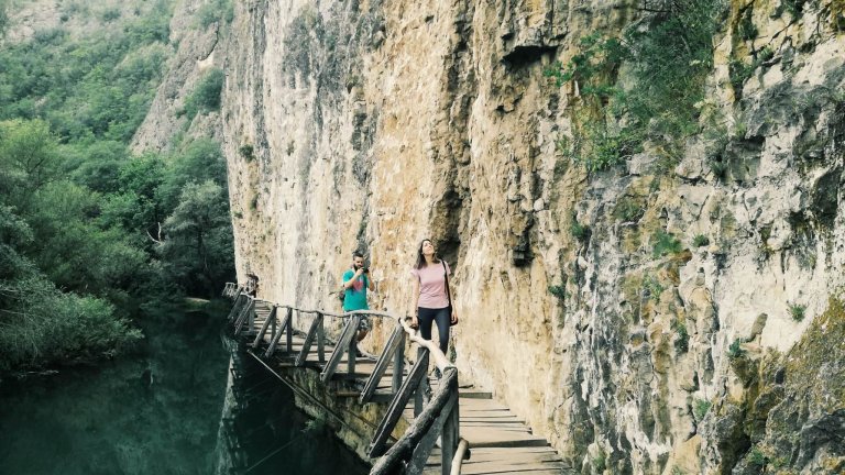 Това е и гледката в следващите 40-ина минути, когато достигаме висока отвесна скала, по чиито извивки се вие един дълъг дървен мост. Тук е и каньонът на реката, който събира най-много внимание и обикновено е обект на повечето снимки от пътеката.