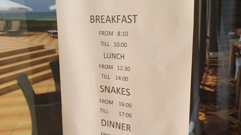 И тъй като наближава време за вечеря, се отправяме към ресторанта. На вратата е залепена бележка, според която между 16 и 17 ч. се сервират (или обикалят наоколо) змии. На къмпинг за вечеря обикновено ям кефал, уловен от приятели в същия ден, който печем на "жив огън": мръсна скара, сложена директно върху пясъка.
