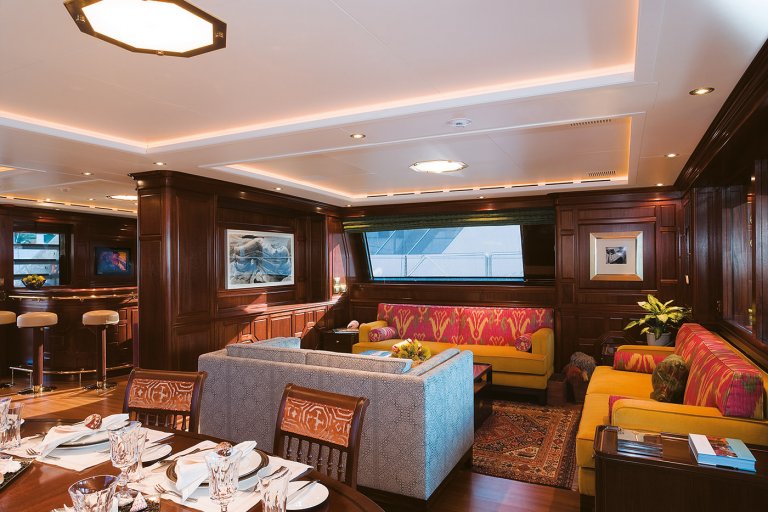 Вътре яхтата е луксозно обзаведена, но и доста модернистично. Като материали са използвани махагон, мрамор, перла и изобилие от рядка по-светла на цвят дървесина.