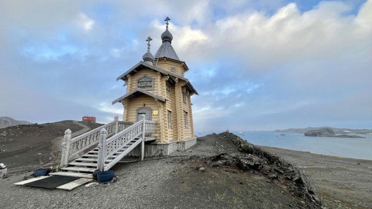 На малкия хълм точно над разпръснатите постройки видях и толкова обсъжданата църква. Поисках разрешение да се кача и да надникна - не можеше да съм точно пред нея и да не вляза. След силния леден вятър и стръмния каменист склон, църквата "Света Троица" ми се стори направо рай. Това е една от осемте християнски църкви в Антарктика и най-южната източноправославна църква в света.