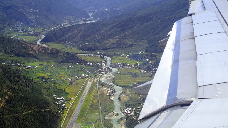 Това няма как да пропусне всеки един, който пристига в страната. Единственото международно летище - Паро, е високо в планината и се слави като едно от най-опасните в света. Хората имат чувството, че крилата на самолета са прекалено близо до хълмовете и се чудят ще успее ли пилотът да уцели тясната долина между тях.