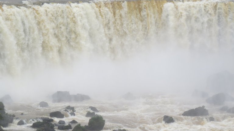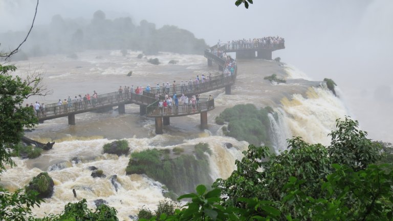 Към нея се прибавят и пръските от водопадите и докато стигнем до моста под "Дяволското гърло", който навлиза навътре над водопадите, вече знаем, че от дъждобраните, които купихме на входа на парка, няма никакъв смисъл.