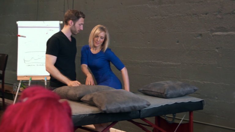Пред събралите се излизат един мъж и една жена - част от програмата за оргазмична медитация. Жената легнала на пода, сваляйки панталоните си, а мъжът с пръсти започнал да натиска специфични точки по клитора ѝ, докато тя не получи оргазъм.