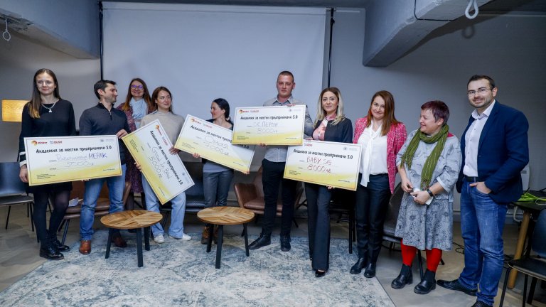 В края на представянето се проведе и кратката церемония по връчване на чековете на победителите, които за първи път се събраха на живо, след като финала на "Академия за местни предприемачи 5.0", по-рано тази година, бе проведен онлайн. Чековете връчи г-жа Диляна Якова, мениджър "Регулации и устойчиво развитие" във Филип Морис България.