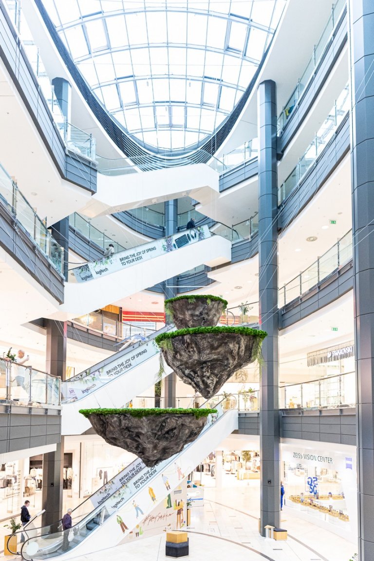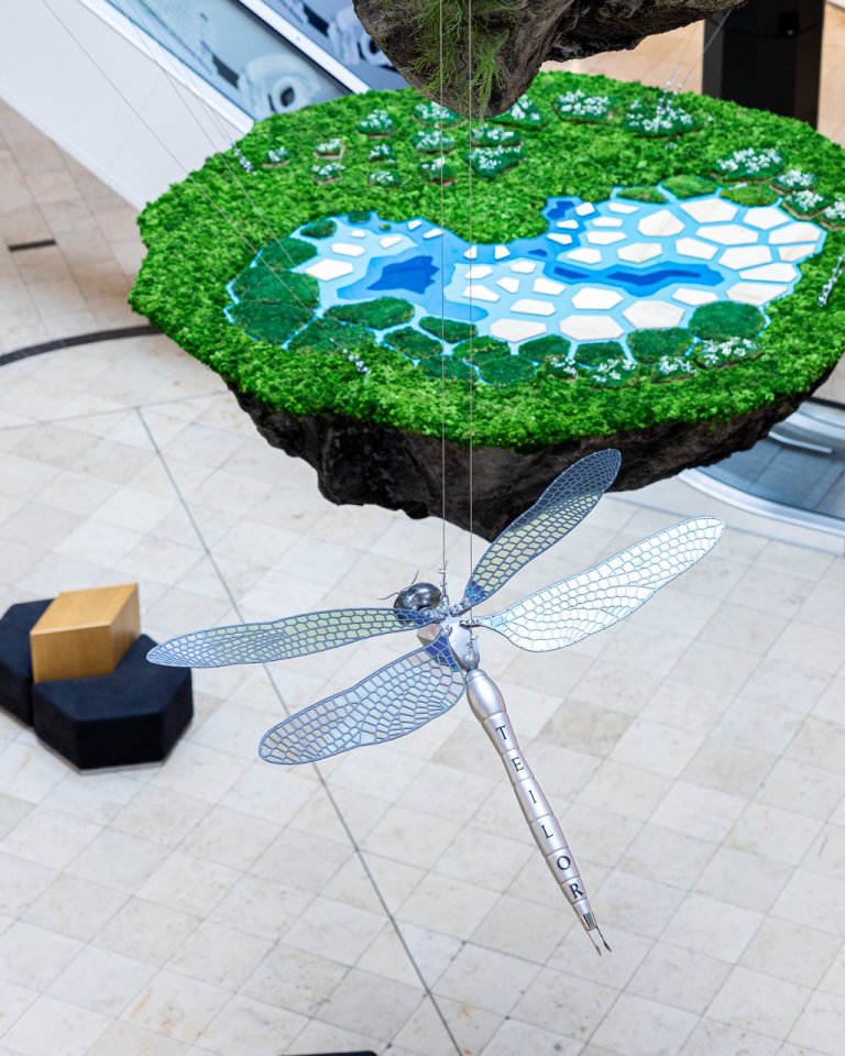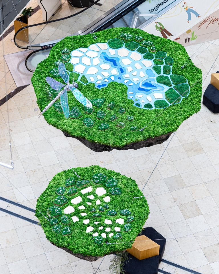 Инсталацията събира фигури на водни кончета и острови, които сякаш са кацнали в търговския център директно от фантастичния свят на Джеймс Камерън.