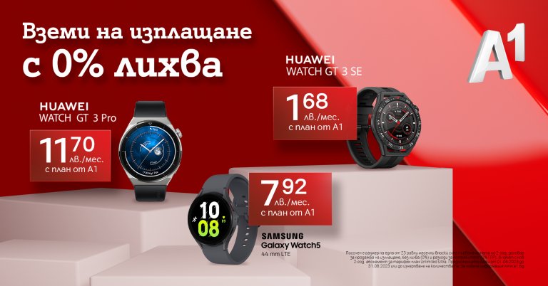 Освен смартфони, в промоционалната кампания на А1 влизат и три топ модела смарт часовници, с които любителите на спорта ще могат да следят своите постижения, а и не само.