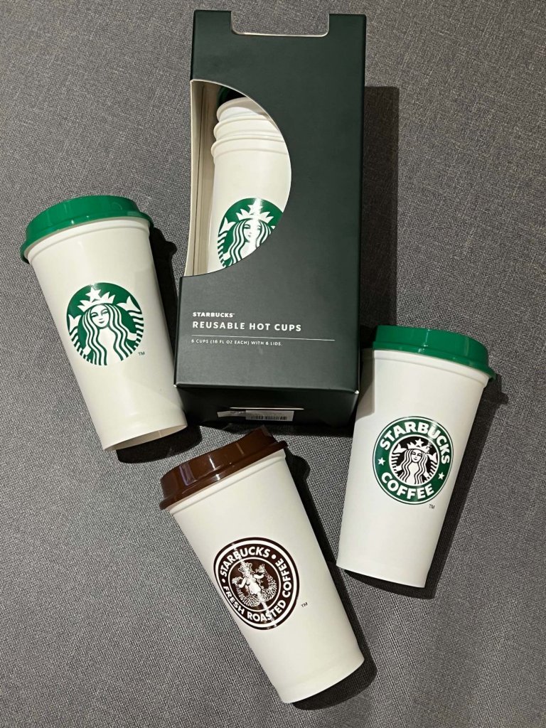 Starbucks също така се опитва да мотивира клиентите да намалят ползването на чаши за еднократна употреба, предлагайки широка гама от оригинални тъмблъри и чаши за многократна употреба. Чашата за многократна употреба е един от най-популярните артикули от мърчандайзинга на Starbucks.
