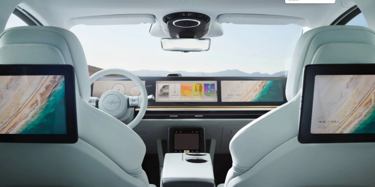 Интериорът на електромобила е точно това, което може да се очаква от Sony - високи технологии и тъчскрийнове навсякъде. Цялото предно табло е заето от огромния дисплей на инфотейнмънт системата, а пред пасажерите на задните седалки също има два дисплея. Освен това пътниците на задните седалки ще могат да играят игри за PS4 и PS5.