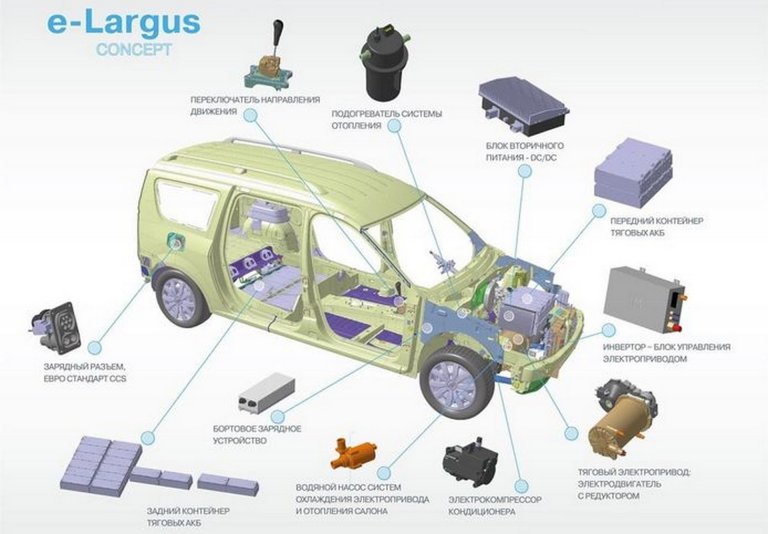 Също под предния капак ще е системата за подгряване на купето. Продуктовите снимки не дават информация дали колата ще разполага с климатик, както и по какъв начин Largus ще бъде снабден със скоростна кутия, подходяща за електрическо задвижване.