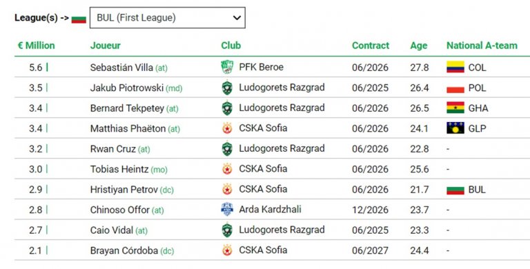 Ето как изглежда Топ 10 на най-скъпите футболисти в България според проучването на CIES: