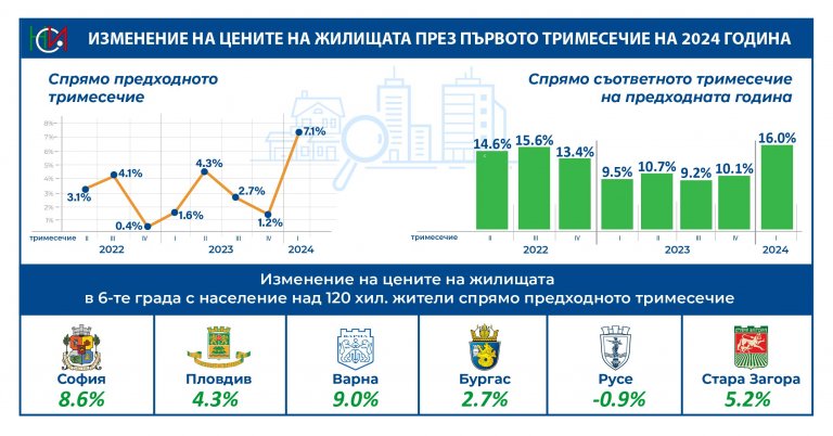 В Бургас поскъпването на жилищата през първите три месеца на настоящата година е 12,3% спрямо същия период на миналата година, в Пловдив - 7,7%. В Русе жилищата са поскъпнали с 9,2%, а в Стара Загора - с 8,8%.