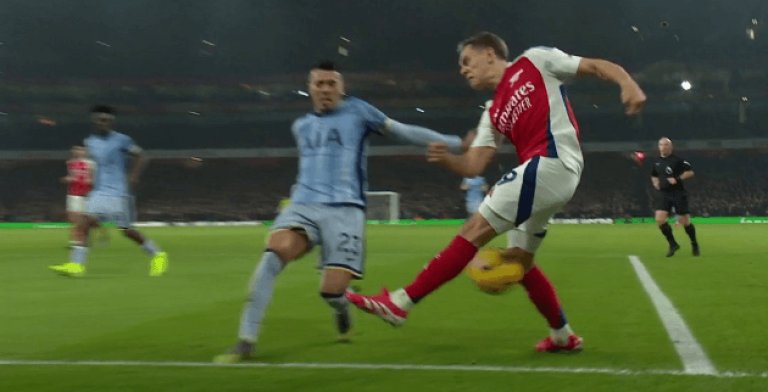 Поро блокира центрирането на белгиеца, след което топката рикошира и излезе от крака на играча на Арсенал.