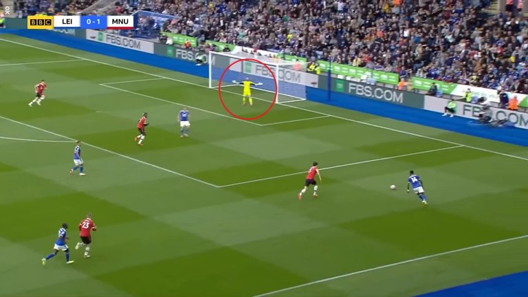 На стопкадрите се вижда как нападателят на Лестър веднага тръгва да атакува топката, докато защитникът на "червените дяволи" е твърде пасивен. Заради което следва и жест на недоволство от Де Хеа, а секунди по-късно - и самият гол.